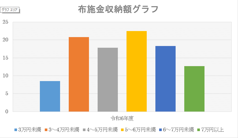 当寺が令和6年度に収納した年回法事の布施(御膳料・御車料・お花料等含む)のグラフを公表いたします。 ※年間の収支決算は神奈川県に提出しております。 ※これらの数値は当寺独自のものであり、宗派(浄土真宗)や地域(川崎市宮前区)、各寺院によって異なります。他寺院様のお布施については参考になりません。
