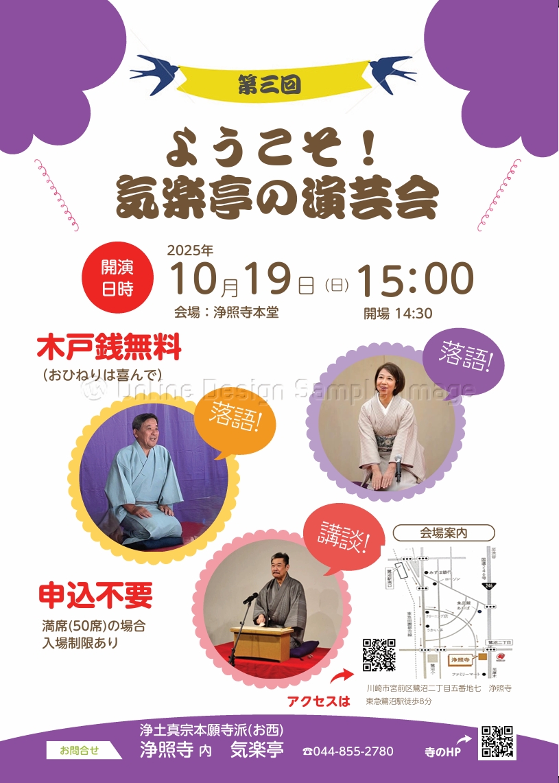 第三回気楽亭公演! 10月19日(日)15:00~ 本堂を利用して地元川崎を中心に活動する社会人演芸集団の皆さんが落語二席、講談一席を披露してくださいます。詳しくはコチラから アクセス 住所 川崎市宮前区鷺沼2丁目5番地7 鷺沼駅南口 徒歩8分 アクセスを更に詳しく